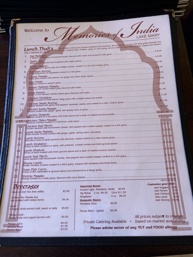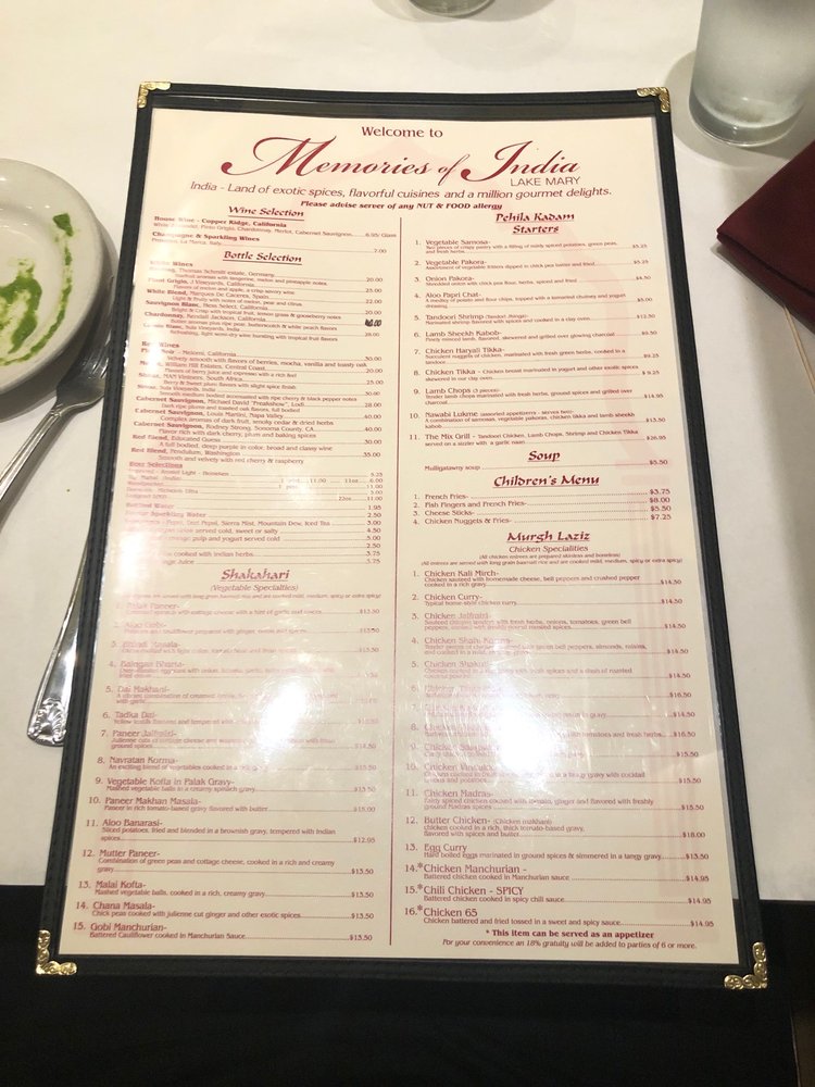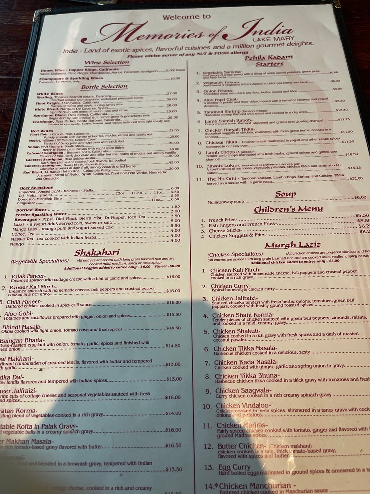 Memories of India is a popular Indian restaurant located at 3895 Lake Emma Rd in Lake Mary, FL. This casual dining spot offers a variety of vegan and vegetarian options, making it perfect for groups, families, or a quiet lunch or dinner. The menu features traditional Indian dishes like Vegetable Samosa, Vegetable Pakora, and Aloo Papri Chat. The restaurant also has a children's menu with items like French Fries, Fish Fingers & Fries, and Chicken Nuggets. Memories of India prides itself on providing delicious Indian cuisine with excellent customer service. Whether you're a fan of spicy curries or mild soups, this restaurant has something for every palate. Don't forget to try their Dal Soup, a comforting and flavorful dish that will transport you to the streets of India.
